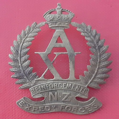 (New Zealand) A11 New Zealand Reinforcements – King’s Crown Gilding Metal Cap Badge.